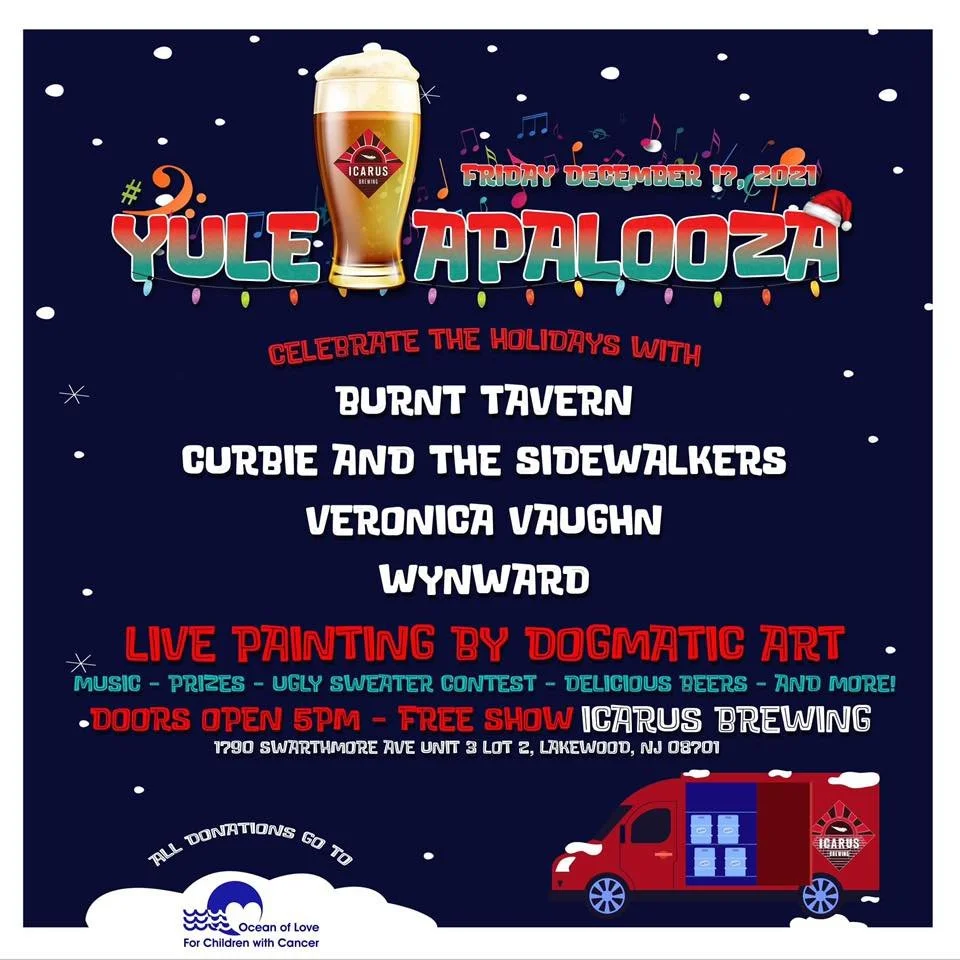 Wynward is having its 4th annual holiday show! This year the event will be held locally at Icarus Brewing on Friday, December 17th. Doors will open at 5pm and go until 10pm. This is a free event, but we please ask that everyone make a donation at the door which will go to Ocean of Love For Children With Cancer. All donations will go to Ocean of Love. The event will feature four bands including Burnt Tavern, Curbie and the Sidewalkers, Veronica Vaughn, and Wynward. There will be an Ugly Sweater Contest, live set paintings by Dogmatic, and much more!