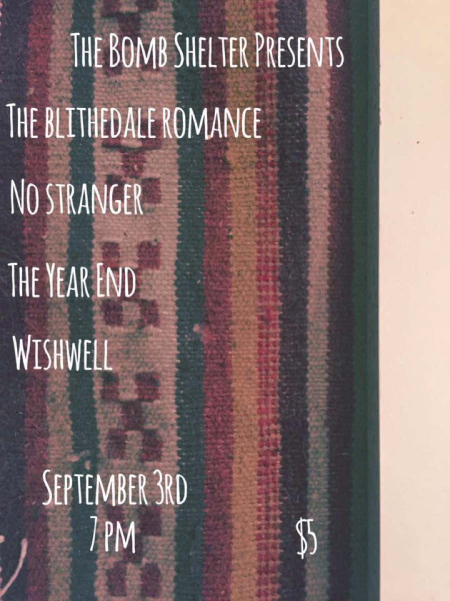 They host basement shows, live sessions, as well as recordings. The Bomb Shelter actually tweeted last year in September of 2015 that they were not going to host shows for a while, so this is one of the first shows in almost a year. This weekend, Saturday, September 3, they’re kicking the month off with a solid show, including one of the bands that helps run the venue, The Blithedale Romance.